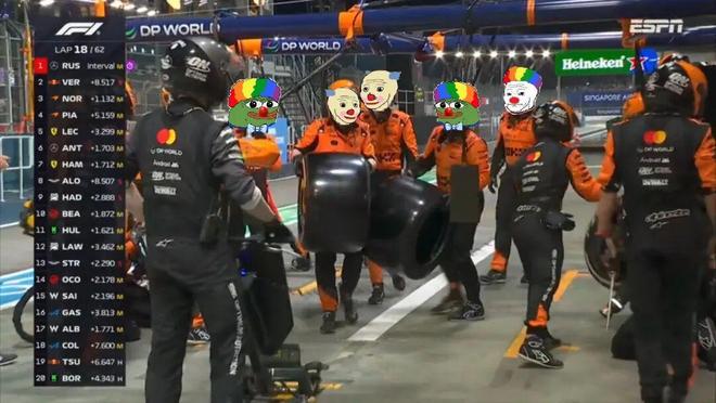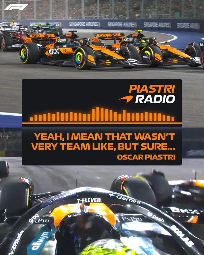拉塞尔获得领跑位置之后直接把维斯塔潘拉开到2.6秒以上,这就把难题抛给了维斯塔潘,在进攻无望的情况下,只能尽可能的防住身后的两辆麦克拉伦。而皮亚斯特里也在随后的TR中表达了对诺里斯的不满,认为队友没有“团队精神”......