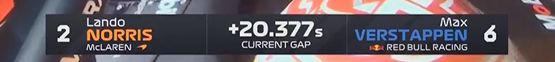 第23圈,维斯塔潘做出了最快单圈,车队让他全速前进,但他表示自己会竭尽所能可感觉所有的事都在和他做对(此前赛车遇到了降档问题)。此时他和诺里斯的差距在20秒左右,若诺里斯进站他依旧将大概率回到诺里斯身前。