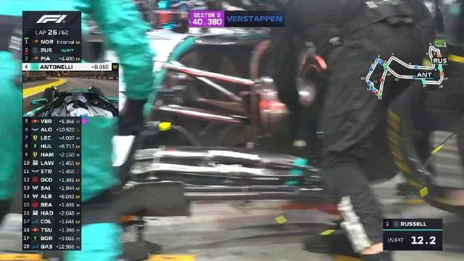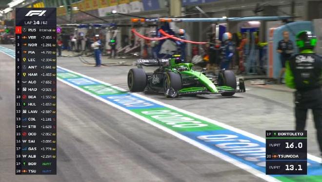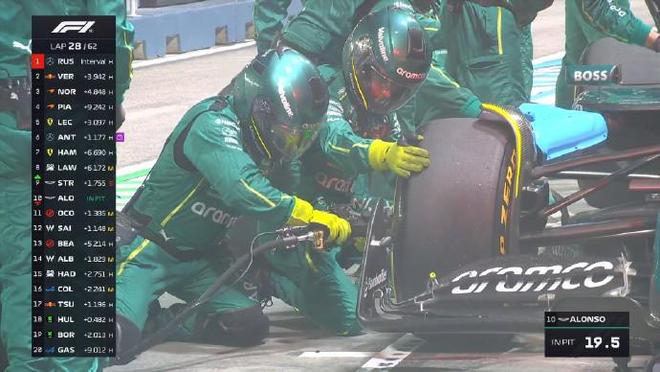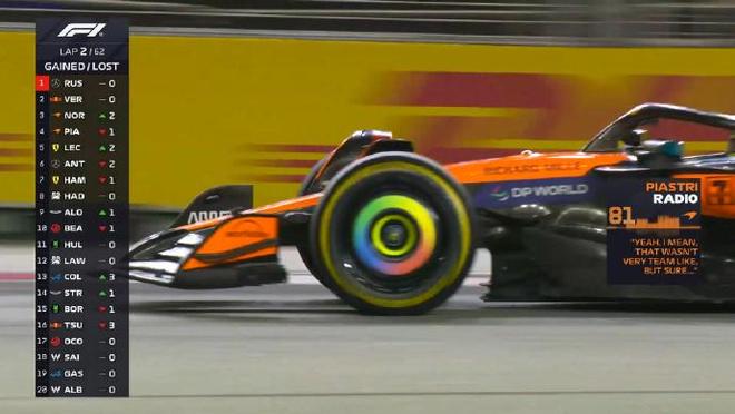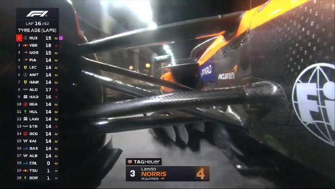 起步轮胎方面:维斯塔潘、哈贾尔、阿隆索、角田裕毅、斯托尔和科拉平托是软胎起步,其余全是中性胎。 第一圈:诺里斯升至第3,但在和皮亚斯特里的争夺过程中,诺里斯碰到维斯塔潘,前翼端板受损 第五圈:拉塞尔的领跑优势来到2.7秒 第十一圈:拉塞尔已经拉开超过五秒的优势 第十四圈:博托莱托和角田进站,索伯赛车更换发车阶段和斯托尔碰撞受损的前翼 第十六圈:迈凯伦车队与诺里斯讨论undercut维斯塔潘,红牛赛车一直在管理起步的这套软胎 第二十圈:维斯塔潘进站并换上了一套全新的硬胎 第二十二圈:勒克莱尔进站,他在霍肯伯格身后出站并完成了关键超越 第二十五圈:皮亚斯特里告诉车队希望用这套中性胎继续跑,维斯塔潘追至汉密尔顿身后,法拉利车手进站 第二十六圈:拉塞尔进站,出站后落在了第四位 第二十八圈:阿隆索进站换胎,用时9.2秒 第四十圈:诺里斯在16号弯失误,和维斯塔潘的距离再次拉开 第四十五圈:霍肯伯格在7号弯前车的脏气流中失控,随后他重新回到赛道 第四十七圈:汉密尔顿第二次进站,并换上软胎 第五十九圈:换上软胎的塞恩斯冲击积分区最后的位置,汉密尔顿和安东内利争夺P5,诺里斯和维斯塔潘继续P2争夺。