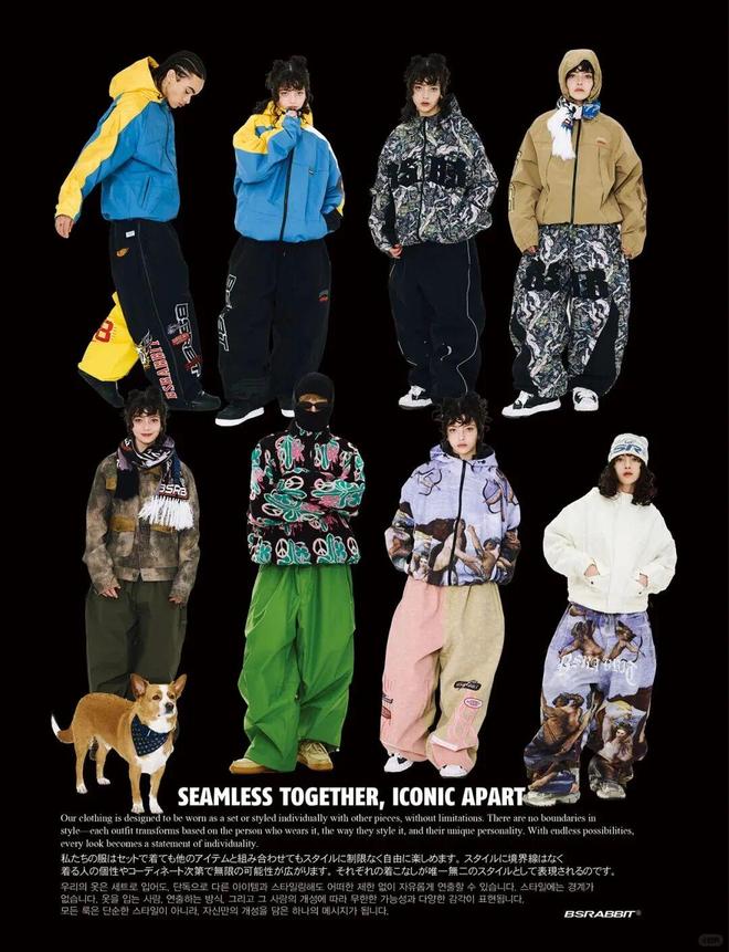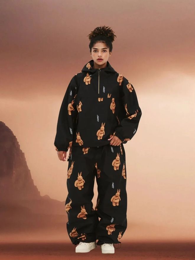 来自韩国的 BSRABBIT ,是创立于 2012 年的韩国品牌,凭借极具标识性的大小孩风格,动物印花和明亮配色吸引了大批颜值至上的性消费者关注。BSRABBIT 的 BS是 SNOWBOARD 和 STREET 的缩写,并以兔子图案作为品牌标识,意为无论是在雪山上还是在路上,都能像兔子一样奔驰。