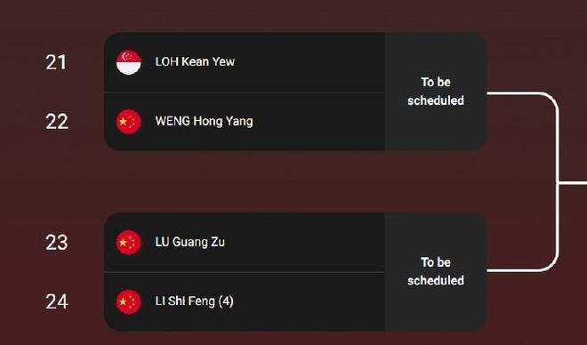 石宇奇 vs 王子维 李诗沣 vs 陆光祖 翁泓阳 vs 骆建佑 王正行 vs 奈良冈功大 |