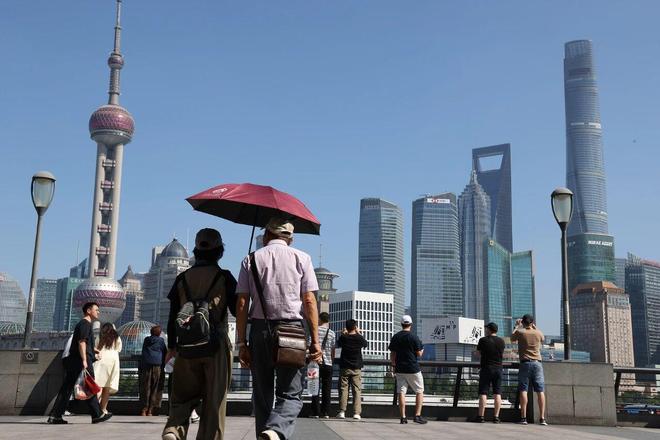 2025年10月11日,不少游客冒着高温、撑着太阳伞在外滩观光平台游览。(图/视觉中国)