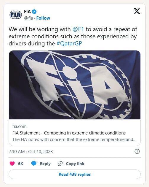 FIA官方发布动态,宣布将与 F1 携手,防止车手遭遇的极端环境状况重演。(图/社交媒体截图)