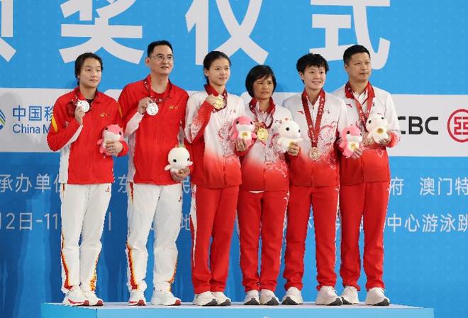 获得冠军的广东队选手林珊(左三)、获得亚军的四川队选手陈佳(左一)、获得季军的广东队选手陈艺文(右二)和她们的教练员在颁奖仪式上合影。 新华社发 以半决赛第一名晋级的陈艺文则认为自己本场决赛的发挥有点不甚理想,不过能看到队友夺金,把金牌留在广东,她也觉得交出了满意答卷。“我第二跳没跳好,应该还是心态上出了点问题,单人比赛和双人那些不同,自己在单人的发挥也一直有点起伏,未来还有进步空间吧。”陈艺文说,“不过这次我们拿到了团体金牌,我还和林珊搭档拿到了双人的金牌,总体来说我觉得还可以,也给自己打8.5分吧。”至于未来自己的发展方向,陈艺文表示她希望能有一个目标,“我想还是先给自己找到一个新的目标,再继续努力。” 采写:南都N视频记者 汪雅云 |
