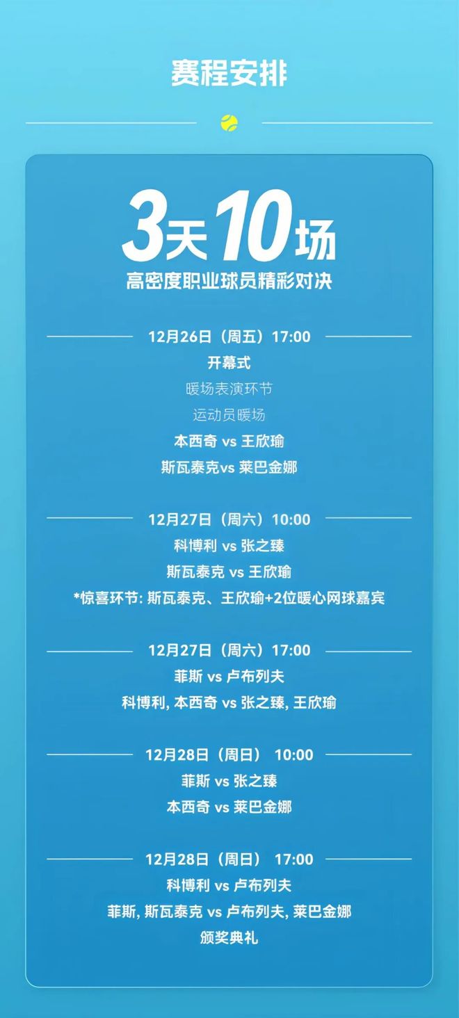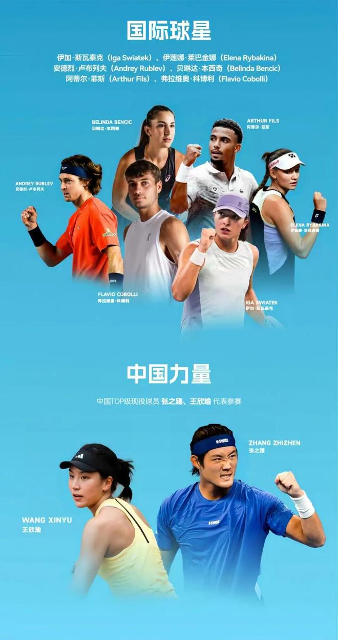 首届世界网球洲际对抗赛 (WTCC,World Tennis Continental Cup) 将于2025年12月26日-28日 在深圳大运中心体育馆举办 赛事介绍 中国首个洲际网球明星对抗赛 项目设置为:男子单打、女子单打、混合双打; 赛制采用三盘两胜制; 比赛形式:欧洲队VS世界队,团体对抗赛 顶尖阵容:洲际对抗看点拉满,让观众看爽! 欧洲队由六届大满贯冠军得主波兰名将斯瓦泰克领衔,瑞士“公主”本西奇、法国小将菲斯、意大利新星科博利组队参赛。世界队则邀请了中国首个奥运会网球混双银牌得主王欣瑜、张之臻,哈萨克斯坦的“冰美人”世界第九的莱巴金娜、两届大师赛冠军俄罗斯的卢布列夫强援加盟。