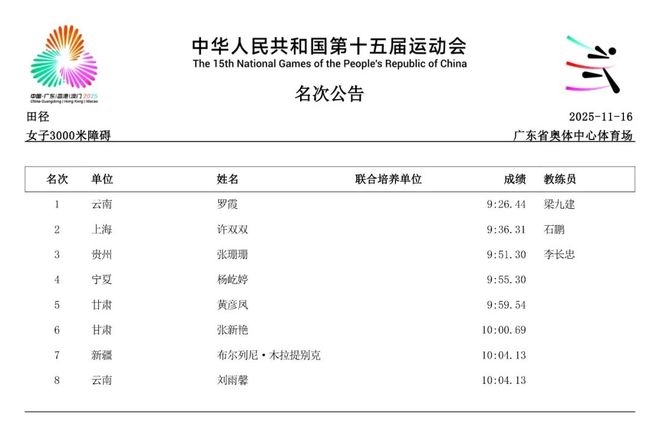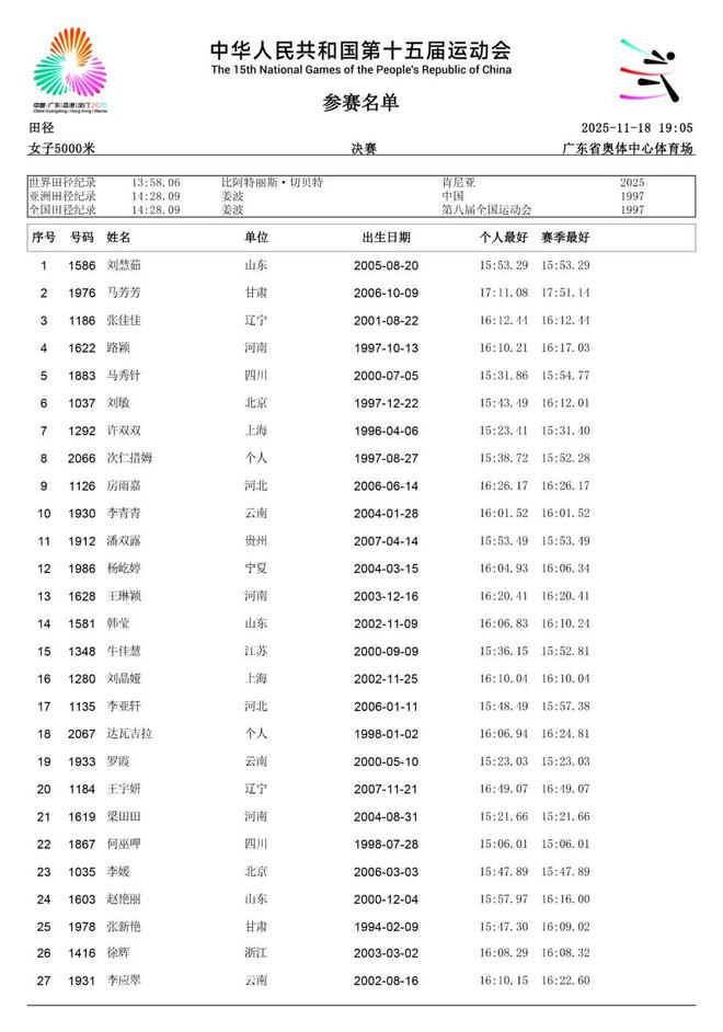 2025年11月21日,第十五届全运会将于深圳落下帷幕。在过去的数日赛程中,女子径赛项目汇集了全国顶尖短跑、中长跑、马拉松和竞走运动员,带来了多场有关速度的巅峰对决。14个纯女子径赛项目的精彩角逐,不仅见证了老将们的坚守,更迎来了超级新星的强势崛起。 本届全运会赛场最大的亮点,莫过于浙江队16岁小将陈妤颉的横空出世。11月17日,她在女子100米决赛中以11秒10的惊人成绩一举夺金,并刷新了该项目的亚洲青年记录。仅仅两天后的19日,陈妤颉在女子200米决赛中再度展现绝对实力,以23秒02的成绩夺冠,创造了该项目近六届全运会最快夺冠成绩,加冕为本届全运会的“双冠王”。 除了短跑赛场的耀眼,中长跑和马拉松项目同样精彩纷呈。11月15日,作为本届赛事首个全运会跨境项目,女子马拉松率先上演激烈角逐。云南名将张德顺展现出强大的统治力,以2小时30分20秒的成绩成功卫冕,成为全运会马拉松女子第一人。而在11月18日的女子5000米决赛中,河南队的梁田田以15分09秒85的个人最好成绩在雨中强势摘金,20日晚又在10000米决赛中以32分23秒40再次夺冠。 随着赛程推进,全运会女子径赛的所有项目已全部结束。我们为大家整理了14项女子径赛的决赛成绩。