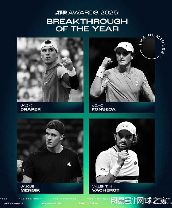 我们再来关注其它消息。北京时间今晨,ATP公布了2025赛季三个年度奖项的提名。其中,年度突破球员的提名是德雷珀、丰塞卡、门希克、瓦舍罗。