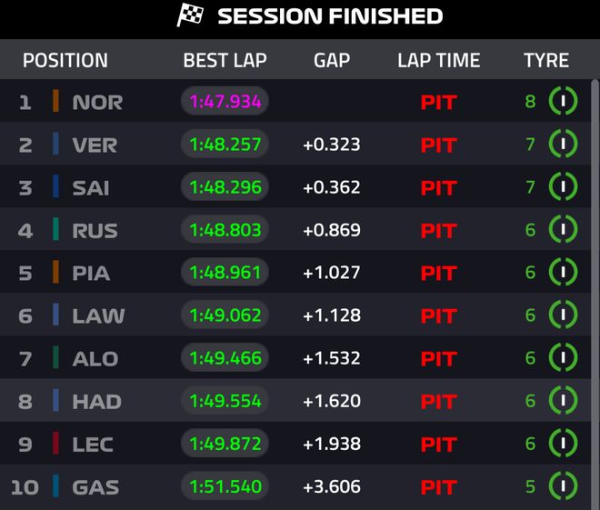 2025赛季F1拉斯维加斯站排位赛刚刚落下帷幕,诺里斯强势夺得杆位!维斯塔潘紧随其后,令人意想不到的是塞恩斯排在第三,拉塞尔第四,皮亚斯特里仅仅位列第五。 拉斯维加斯作为沙漠城市,全年降水稀少,不过排位赛开始前,整个城市却下起了雨!大家只能以全雨胎开始排位赛。Q1开始后,赛段黄旗不断,维斯塔潘很快找到节奏刷紫,拉塞尔随后以1:53.144的成绩领跑,最后一分钟时阿尔本上墙,好在他离维修区不远,直接进站。 汉密尔顿遭遇黄旗影响了自己做成绩,不得已垫底被淘汰,安东内利则是因为自己失误同样止步Q1,其余三位车手是阿尔本、博托莱托、还有角田。 Q2上来皮亚斯特里一度刷紫,不过随着赛道变干,劳森和哈贾尔先后来到榜首,诺里斯也反超皮亚斯特里来到第三的位置。Q2结束时,拉塞尔冲到第一位,皮亚斯特里险些被淘汰。被淘汰的是霍肯伯格、奥康、比尔曼、克拉平托以及用半雨胎跑了4圈的斯特罗尔。 Q3起表,大家纷纷换上半雨胎,塞恩斯率先刷紫,随后皮亚斯特里以1:49.136刷到P1,此时诺里斯仅仅排在第三,不过很快他就翻掉皮亚斯特里来到第一的位置。勒克莱尔则是一路从P3掉到P9。 最终诺里斯取得杆位,维斯塔潘第二,塞恩斯第三,拉塞尔第四,皮亚斯特里第五,劳森第六,勒克莱尔仅仅位列第九。 |
