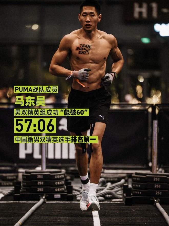 HYROX风潮席卷国内,推动赛事水准持续跃升,中国选手的表现也因此不断突破。本站比赛中,彪马中国合作的HYROX运动员盛志康、陆鹏,以及彪马战队成员马东昊、胡志博,在男双精英组别中均于60分钟内完赛,成功「彪破60」。