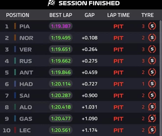 短暂的红旗过后比赛恢复,最后的飞行圈,诺里斯出现失误放弃了再做成绩,皮亚斯特里做出1:19.387拿到杆位!维斯塔潘刷掉拉塞尔排在第三,拉塞尔第四,安东内利第五,哈贾尔第六,看来红牛2026赛季的席位就是哈贾尔的了。