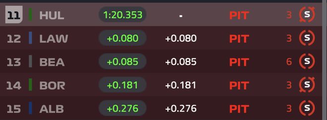 Q1起跑后威廉姆斯率先开始做成绩,皮亚斯特里第一个飞行圈就刷紫到1:20.739,这还是用的旧红胎。两台法拉利略显挣扎,第一个飞行圈汉密尔顿和勒克莱尔分别落后皮亚斯特里1秒开外,好在第二个飞行圈,两人都进入前十。