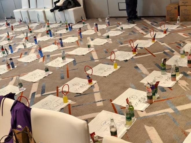 志愿者工作有时候总是重复而琐碎。 受访者供图 黄雪梅的黄胶带 在场馆外的信息服务台,同样在赛前一天,一场场超越语言的沟通早就开始。上海体育大学英语专业的王泽琪面对一位肯尼亚跑者,低头对照翻译软件,反复确认后在登记表上工整写下:“明早10点,自助理疗室。” 这是今年上马推出的选手赛后尊享体验,包括赛后定制补给、专业体能恢复和尊享环境与便利服务。对于她的工作内容,王泽琪向澎湃新闻(www.thepaper.cn)记者如数家珍,“这边的理疗室分两种,上马提供的常规室要提前一天约,轮椅运动员训练完都会来用;而自助室是给带私人理疗师的选手用的。” 王泽琪的笔记本上记满了这些细节,其中比预约体能恢复室更复杂的工作,是特邀运动员的补给管理。 “我们要把他们的瓶子分类好,精准投放到8个补给点位,因为每位运动员在每个点位的补水量都不同。”王泽琪说,“全程8个点位、10张桌子、每桌5瓶水,还要记住部分选手在5公里和40公里处不需要补水。” 精英选手的补给就是他们在跑道上的“弹药”,要共同保护好这些“弹药”,“小马达”和精英跑者自然短暂建立了一份战友的情感。 为了在补给点众多饮料瓶中快速识别,精英跑者们各显神通:有人用扭扭棒做成毛绒装饰,有人自制拎手,更多人选择用组委会提供的彩色胶带进行标记。 当志愿者称赞黄雪梅选手的黄色胶带非常醒目时,她笑着揭秘:“只是因为我姓黄。” 而当沈妮和同伴匆匆赶到时,两位女选手立刻动手帮她装饰瓶子,一旁的王泽琪也主动加入帮忙贴标签。 “结果我好心办坏事还贴错了。”王泽琪回忆时依旧有些不好意思,“原来她们每个点位需要的水量都不同,比如40公里可能就喝得少一点,标签不能混贴。” 这个因热心而产生的小差错,并没有引起沈妮的不开心,王泽琪说:“沈妮笑着说,不用重贴了。” 从凌晨2点40分出发,到清晨7点发枪前最后一分钟的忙碌,这四个多小时只是“小马达”在上马当天的前半程“奔跑”。