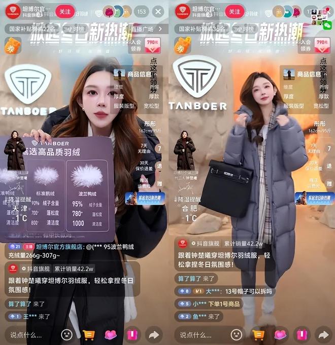 坦博尔创意实景直播 图源:抖音 总的来说,高端市场上限高但难在培养用户黏性、建立品牌认知,所以品牌需要把故事讲透;入门级市场容量大,但消费者过于分散,短视频种草、直播拔草则是最简单直接的电商交易链路,能帮品牌提高营销转化效率。营销策略各有侧重,但可喜的是,不同品牌都能找准目标定位。 市场分层:高端化并非唯一出路从产品设计到营销策略,品牌的经营思路都愈发理性,分化也越来越明显。这背后,是整个羽绒服市场的加速分层:高端、入门级市场持续壮大,品牌逐步向两端靠拢,形成“K”型竞争格局。 根据咨询机构博研智尚的报告,过去一年1500元以上高档羽绒服占有率超过30%,除了波司登、高梵这些老玩家之外,凯乐石、FILA等也在发力,凯乐石旗下高端产品5000GT羽绒服今年双十一初期一度卖到断货。Moncler今年整体业绩不算出色,前三季度总营收仅为18.41亿欧元、同比持平,但中国市场仍维持良好增长势头。 与此同时,入门级市场也保持坚挺,鸭鸭部分售价低至百元以下的轻薄款羽绒服在拼多多卖出近50万件,骆驼、雅鹿等品牌的低价位产品也十分畅销。