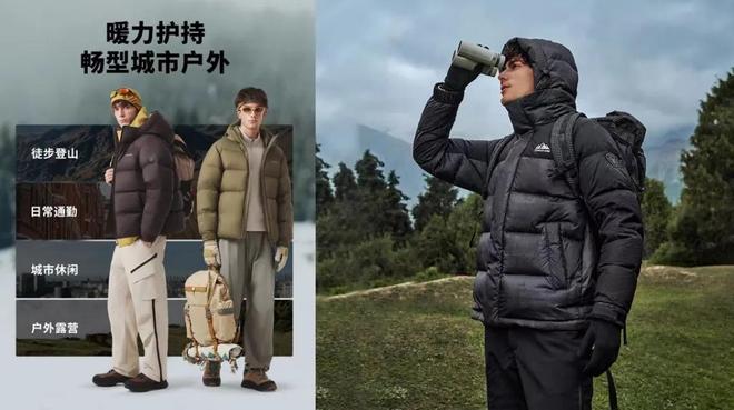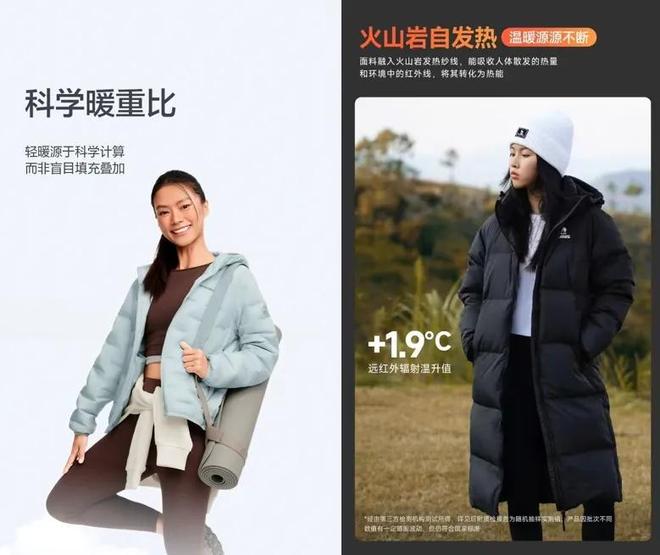 产品革新:拼性能,更拼“颜值”理性的回归,首先体现在产品性能设计上。 羽绒服带有强功能属性,御寒性能决定产品力上限。过去几年,各大品牌在高端面料上大做文章——能快速升温的石墨烯、轻量化的纳米级超细尼龙、向军事级防御标准看齐的eVent面料得到广泛应用,充绒量也越卷越高。 不过对于基数最大的普通消费者而言,通勤、户外运动等日常场景基本用不上这些极限材料,羽绒服更重要的是做好日常御寒,而非追求各种极限技术。 比如波司登今冬主打产品之一“云感鹅绒”系列,就强调“科学暖重比”概念:充绒量与衣服重量为0.2:1,达到轻、暖平衡效果。此外,各种太空科技、极地锁温技术也开始让位于更贴合实际需求的“微创新技术”,如骆驼“火神”系列羽绒服借助火山岩发热纱线,收集环境中的红外线转化为热能,达到较好的热能锁温效果。