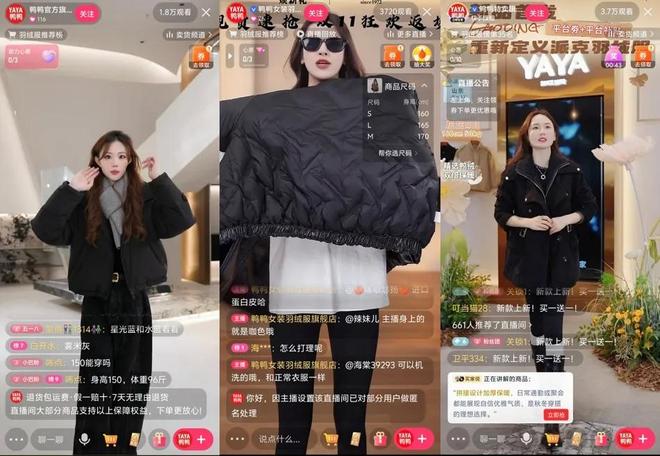 鸭鸭、骆驼主推明星同款 图源:小红书 另一方面,深度布局淘天、抖音、快手等平台,短视频+直播多管齐下。 最近几年,一众老牌国货品牌在线上渠道取得了很大进步,比如鸭鸭羽绒服抖音平台销量一度超过波司登,短短四年间GMV翻了超过百倍。完整的短视频种草、直播带货布局,功不可没。 以鸭鸭为例,目前已经建立起自播为主、达播为辅的直播链路,在抖音、快手等平台建立庞大的直播账号矩阵。今年双11初期,快手鸭鸭特卖旗舰店自播GMV突破品牌历史峰值,跃居快手服饰鞋靴日榜TOP5。