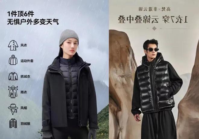 波司登“云感鹅绒”系列/骆驼“火神”系列 图源:天猫 其次,羽绒服“一衣多穿”也成为新潮流,产品适配的场景、季节越来越丰富。 这一变化,一方面是因为消费者变得更理性,希望做到“物尽其用”。 比如伯希和的三合一羽绒服系列以“1件顶6件”为卖点,高梵的黑金5.0系列“云锦鹅绒服”则打出“1衣7穿”的口号,满足春、秋、冬季穿衣需求。尽管高梵黑金5.0系列产品售价并不便宜,达到3000元以上,但“1衣N穿”的卖点,以及适配不同场景、季节的设计理念,却能给消费者带来更多“实用感”。