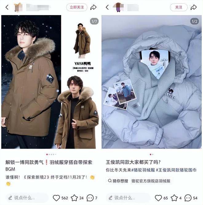 波司登营销支出上涨 图源:财报 相比之下,专注入门级市场的品牌更讲究即时转化。 一方面,靠明星营销打开局面。 一众老牌国货品牌都遵循了这个做法:骆驼同时签下王俊凯、迪丽热巴,鸭鸭不久前续签了王一博,雪中飞签下了成毅。品牌结合明星个人特质,推出各种“明星同款”,在社交平台制造话题,向粉丝种草:如鸭鸭围绕王一博的运动形象,主推运动时尚款,走轻户外路线;骆驼则挖掘王俊凯身上的少年感,走青春、时尚路线。 高端品牌和明星代言人的合作看重长期回报,明星代言是其高端形象塑造的其中一环。大众化品牌的玩法简单直接,更看重明星的带货能力。在信息爆炸、注意力分散的年代,明星的认知度、跨越不同圈层的影响力优势愈发突出,绑定明星资源、打造明星同款,是品牌抢占市场的高效途径。