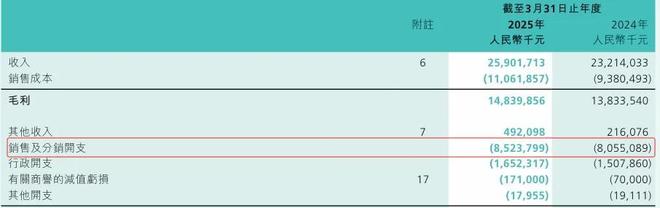 波司登上海南京东路门店焕新亮相 图源:微博 消费者认知视角变得更多元、更挑剔,品牌唯有拿出一套完整的叙事方案,才能更好维系自身高端形象、提高说服力。高梵创始人吴昆明就向「深响」表示,品牌要建立高端化认知,不仅需要以国际大秀、贵族王室做背书,线下门店也有在终端传递高端化形象的意义。 但这种高举高打的营销策略也有副作用:推高营销支出。 波司登财报显示,2024/25财年销售及分销费用为85.24亿元,费用占比达32.9%,过去五个财年持续上升。营销支出过高,对波司登的盈利产生了一定影响,2022-2025财年其净利润复合增速为19.45%,远低于上一个三年周期的40.58%。 Moncler也有类似情况,今年上半年净利润同比下跌15%至1.54欧元,集团高层此前曾在财报中承认营销支出占比上升是影响利润率的重要因素。 高端品牌营销着眼长远,需要立好品牌形象、沉淀高净值客群,才能促进长期转化,这一做法无可厚非,但过程中必然会有阵痛,关键就在于如何尽量降低代价。