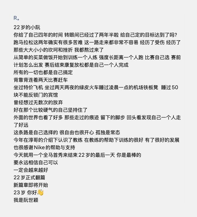 上马比赛日,是阮世颖23岁的生日。今年上马,也是这个从云南文山市丘北县双龙营镇上来的小姑娘的人生首马。比赛日早晨5点醒来后,阮世颖给自己写下了一段“生日独白”。写完发在朋友圈,准备出发时,阮世颖对着酒店房间内的镜子大声对自己说了两句话——我可以的,加油,我行的。