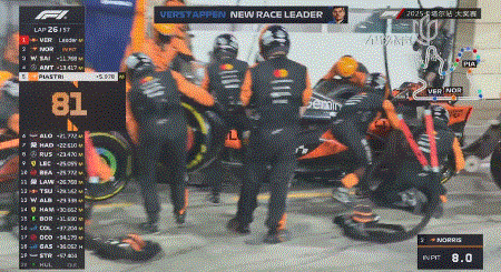 第43圈,皮亚斯特里先行进站!仅耗时1.8秒的他,出站后排在了维斯塔潘身后16秒左右的距离!而比赛还剩下14圈!