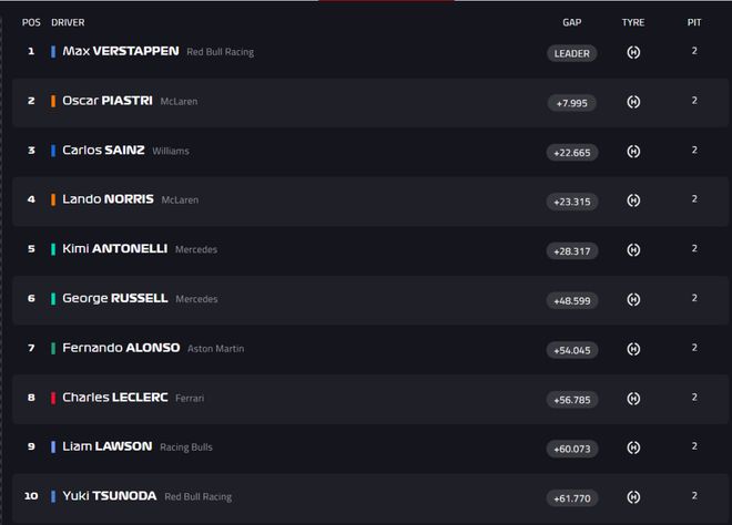 来到21圈,皮亚斯特里通过TR向车队表示自己的左前胎已经有些挣扎了!第24圈,皮亚斯特里进站换胎耗时3.1秒,出站后排在阿隆索身前,处于当时的第5名(因为诺里斯还未进站)!