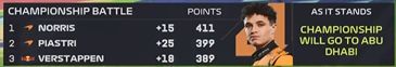 随后官方给出数据统计,如果比赛以这样的排位结束,那么皮亚斯特里将追近10个积分,维斯塔潘也将追回3分,三人将带着22分的积分差距进入阿布扎比大奖赛。