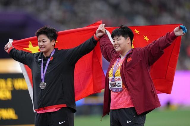 9月15日,在日本东京举行的2025年世界田径锦标赛女子链球决赛中,中国选手赵杰和张家乐分别获得银牌和铜牌,图为赵杰(左)和张家乐在赛后庆祝。 新华社记者 鞠焕宗 摄