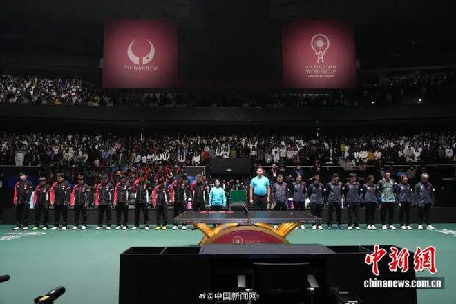 11月30日上午,2025年成都国际乒联混合团体世界杯开赛前,国际乒联官员、参赛运动员、上万名观众共同为香港火灾罹难者默哀60秒。