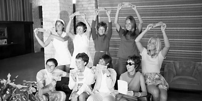 “非打不可”的社会背景 自1968年网球运动职业化后,男女运动员在大型赛事中的收入差距便日益悬殊——在公开赛时代早期,男子选手的奖金能达到女子的12倍。 幸运的是,美国女子网球界有一位划时代的先锋——比利·简·金。作为当时网坛最顶尖的选手之一,她不甘被男性主导的体育体系定义价值。 比利·简·金说服了另外八位志同道合的女网球选手,共同创立了一个独立的职业巡回赛。这九位女性也被载入史册,称为 “original 9”。 她们以极具象征意义的1美元签下合同,用坚定的姿态对抗美国网球联合会的施压,在男性主导的赛场中,硬生生为女性运动员开辟出一条全新的道路。 1973年,WTA(国际女子网球协会)就此诞生。