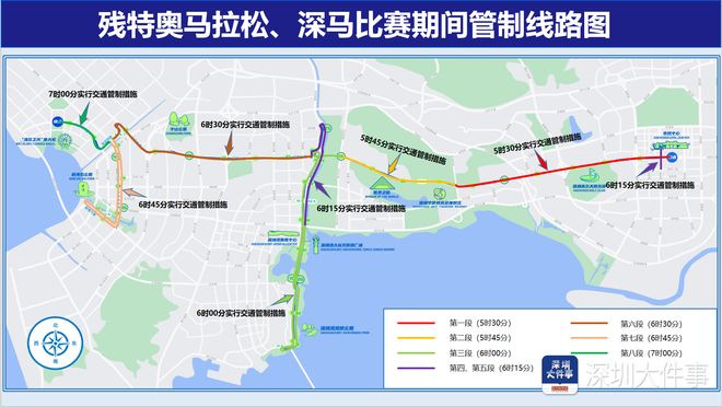 深圳市交管支队南山大队在龙海家园小区提前向居民告知本周日马拉松赛事交通管控情况。 交通管控具体措施 (一)赛前临时管制时间及路段 12月4日12时至12月7日17时,对深南大道(金田路-益田路段,东往西方向)辅道路段实行临时管控; 12月5日22时至12月7日14时,对深南大道(市民中心广场段,东往西方向)左侧快车道实行临时管控(长度为100米)。 12月7日0时至12月7日10时30分,对深南大道(皇岗路-益田路段,东往西方向)实行临时管控; 12月7日0时至12月7日9时,对福中三路(彩田路-金田路段、金田路-益田路段,东西双方向)、鹏程五路(福中路-深南大道段,南北双方向)、海田路(福中路-深南大道段,南北双方向)、中心八路(福中三路-深南大道段,南北双方向)实行临时管控; 12月7日2时至12月7日9时,对彩田路(福中路-福华路段,南北双方向)实行临时管控; 12月7日4时至12月7日9时,对福中路(益田路-彩田路段,东西双方向)、金田路(福中路-福华一路段,南北双方向)实行临时管控; 12月6日0时至12月7日17时,对海秀路(宝华路-宝兴路段,东西双方向)、宝兴路(海秀路-创业一路段,南北双方向)实行临时管控; 12月6日0时至12月6日6时、12月6日23时至12月7日17时,对创业一路(宝兴路-宝华路段,西往东方向)实行临时管控; 12月6日22时至12月7日17时,对宝华路(海秀路-创业一路段,南北双方向)实行临时管控。 (二)比赛期间动态管控措施 7日赛事当天,交警将对部分道路分时分段进行临时管控。 5时30分开始,对深南大道(益田路-侨城东路段东往西方向)、深南大道(皇岗路-新洲立交路段西往东方向)实行临时管控; 6时15分开始,益田路(福中三路-福华一路段南北双方向)实行临时管控; 5时45分开始,对深南大道(侨城东路-沙河东路段东往西方向)实行临时管控; 6时00分开始,对深南大道(沙河东路-沙河西路段东往西方向)、沙河西路(深南大道-东滨路段北往南方向)、望海路(东滨路-南山中心路段南北双方向)、沙河西路(东滨路-滨海大道段南往北方向)实行临时管控; 6时15分开始,对沙河西路(滨海大道-金铜路段南往北方向)、沙河西路(金铜路-深南大道段北往南方向)实行临时管控; 6时30分开始,对深南大道(沙河西路-宝安大道段东往西方向)、宝安大道(深南大道-新安西路段东往西方向)、宝安大道(新安西路-湖滨西路段西往东方向)、湖滨西路(梦海大道-宝安大道段东西双方向)实行临时管控; 6时45分开始,对梦海大道(湖滨西路-前海大道路段南北双方向)、前海大道(金岸中街-梦海大道段东西双方向)实行临时管控; 7时00分开始,对湖滨西路(梦海大道-海秀路段东西双方向)、海秀路(湖滨西路-宝兴路段东西双方向)实施临时管控。 (三)赛事周边路段实施流量控制 由于本次马拉松比赛时间长,且位于深圳市中心干道上,为避免道路拥堵,交警将对深南大道、沙河西路、宝安大道、梦海大道、前海大道、海秀路等道路实施流量控制,同时将对香梅路、沙河东路、科苑南路、南山大道等相关平交路口依次实施流量控制,相应减少赛事周边道路的交通压力。 据了解,为最大限度降低赛事对交通的影响,深圳交警赛时将实时监测绕行路段车流量,动态调整信号灯配时,延长拥堵路段绿灯时长、缩短空驶路段等待时间,同时设置“绿波带”,提升通行效率;赛后将通过多路口信号灯联动、人工干预疏导等方式,快速分流沿线返程车流,加速交通恢复。