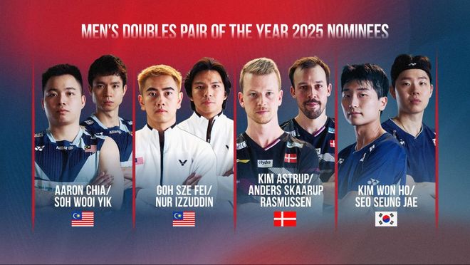 双打方面,刘圣书/谭宁被提名年度最佳女双,其他三对组合分别是韩国的白荷娜/李绍希、金慧贞/孔熙容以及马来西亚的陈康乐/蒂娜。冯彦哲/黄东萍和蒋振邦/魏雅欣一同被提名最佳混双,竞争组合是泰国的德差波/苏皮萨拉和马来西亚的陈堂杰/杜依蔚。男双四对提名组合分别是马来西亚的谢定峰/苏伟译、吴世飞/伊祖丁,丹麦的阿斯特鲁普/拉斯姆森,韩国的金元昊/徐承宰。 本年度的各项最佳奖项是根据球员在2024年12月1日至2025年11月30日这个周期中的表现为依据。世界羽联在公告中表示,奖项评定根据以下两项因素综合评定:一是过去52周的世界排名积分,二是由五位专家组成的评审团对球员在以下赛事中的投票得分:2024年杭州总决赛、2025年所有超级1000赛和超级750赛,2025年世锦赛(2024年杭州总决赛和2025年世锦赛的积分计算为两倍)。
