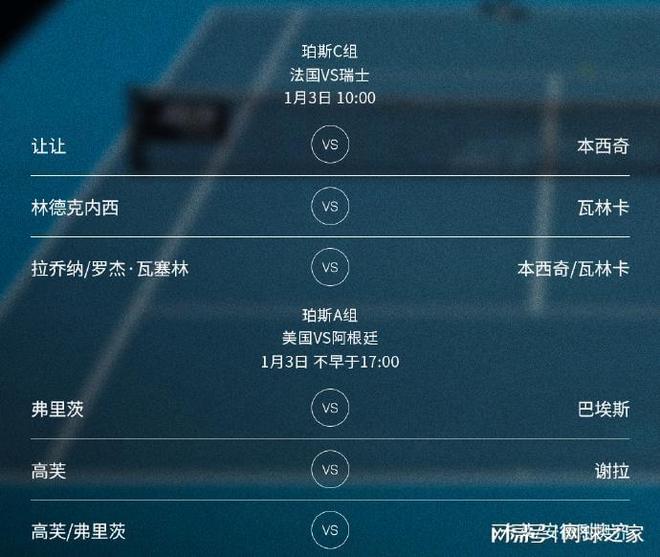 珀斯赛区的法国队与瑞士队的较量在北京时间今天上午10点打响,双方的对阵是:让让 vs 本西奇、林德克内西 vs 瓦林卡、拉乔纳/罗杰-瓦塞林 vs 本西奇/瓦林卡。截至发稿时,瑞士队依靠本西奇两盘获胜,取得1-0的领先。 北京时间今天下午2点半和5点时段,还有澳大利亚vs 挪威和美国vs 阿根廷两场较量,其中小野兔对决鲁德、弗里茨PK巴埃斯、高芙对阵谢拉等场次引人关注。
