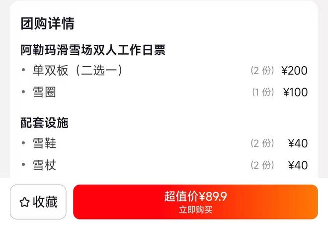 曾经,滑雪被视为“中产”的专属运动,一身名牌滑雪服、上万的滑雪装备、雪场大几千的住宿、来回的路费和餐饮,全套下来真浇灭了很多人学滑雪的念头。 然而,近几年随着穷滑的兴起,普通人终于也可以圆滑雪梦了。 就拿滑雪入场券来说,只要打开团购平台,满眼都是原价288元的滑雪票只要48元,甚至还有滑雪场89.9元的门票中包含了2份雪板、一份雪圈、2份雪鞋、2份雪仗的促销信息,可以说这样的优惠力度让所有人在购买时毫无压力。
