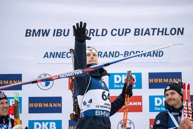 在产品端已有端倪。据懒熊体育观察,挪威运动员韦特勒·肖斯塔·克里斯蒂安森(Vetle Sjåstad Christiansen)刚刚在12月18日至21日的法国安纳西·勒格朗博尔南的冬季两项世界杯男子10KM项目中获得冠军。颁奖台上,这位传奇运动员展示的正是Salomon最新即将发布的EQUIPE系列越野滑雪双板产品。