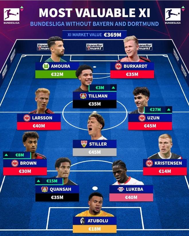 门将 阿图博卢(弗赖堡)1800万欧元 后卫 拉斯穆斯-克里斯滕森(法兰克福)1400万欧元、卢克巴(RB莱比锡)4000万欧元、夸安萨(勒沃库森)3500万欧元、纳撒尼尔-布朗(法兰克福)3000万欧元 中场 施蒂勒(斯图加特)4500万欧元、詹-乌尊(法兰克福)4500万欧元、胡戈-拉松(法兰克福)4000万欧元、马里克-蒂尔曼(勒沃库森)3500万欧元 前锋 伯卡特(法兰克福)3500万欧元、阿穆拉(沃尔夫斯堡)3200万欧元 总身价:3.69亿欧元 |