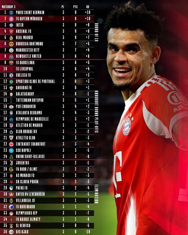 北京时间10月23日,在欧冠联赛阶段第3轮的比赛中,拜仁慕尼黑主场4-0大胜布鲁日,目前他们以三战全胜的成绩位列积分榜的第二位,赛后这家德甲豪门官方也在社交媒体上晒出了欧冠的积分榜,预热他们下一轮与巴黎圣日耳曼的焦点战。