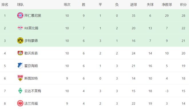 在积分榜上,拜仁以28分排名榜首,战绩是9胜1平,是德甲唯一保持不败的球队。莱比锡以22分排名第2,落后6分。多特蒙德排名第3,拿到21分。勒沃库森大胜之后缩小与身前球队的差距,以20分排名第4。霍芬海姆拿到19分,排名第5。第6的是斯图加特,拿到18个积分。 |