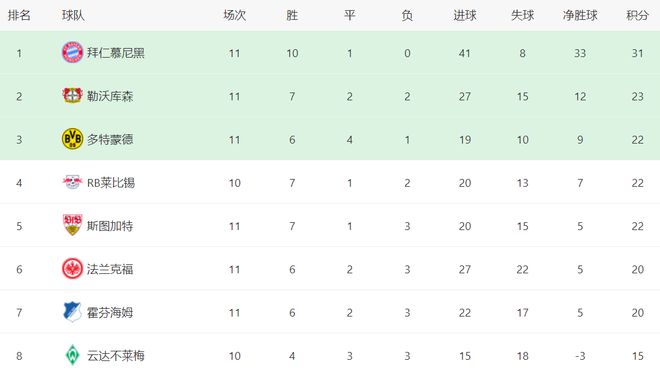 在积分榜上,拜仁牢牢占据榜首位置。拜仁10胜1平保持不败,拿到了31分。勒沃库森赢球之后,总积分达到23分,超越了多特蒙德,升到第2名,但与拜仁的差距依然很大,足足落后8分。多特蒙德以22分排名第3。莱比锡和斯图加特也是22分,排名第4和第5。法兰克福和霍芬海姆都是20分,排名第6和第7。不莱梅以15分排名第8。 |