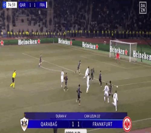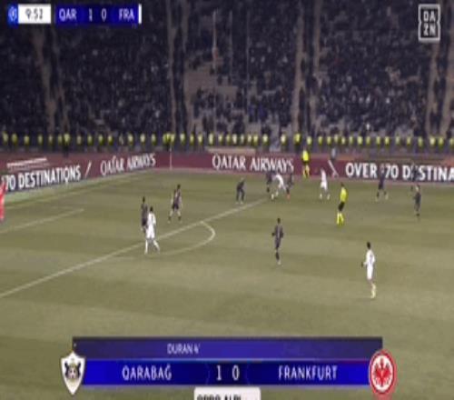 北京时间1月22日欧冠联赛阶段第7轮,卡拉巴赫主场对阵法兰克福。上半场,卡米洛-杜兰先拔头筹,随后乌尊破门扳平比分。下半场,沙伊比点射建功,卡米洛-杜兰闪电扳平梅开二度。补时阶段,穆斯塔法扎达读秒破门完成绝杀。最终法兰克福2-3遭卡拉巴赫读秒绝杀被提前淘汰。 关键事件 第4分钟,先拔头筹,卡米洛-杜兰破门,卡拉巴赫1-0