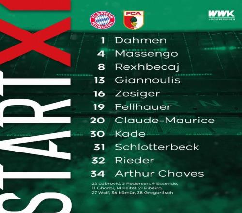 拜仁首发:40-乌尔比希、19-阿方索-戴维斯、3-金玟哉、4-约纳坦-塔、21-伊藤洋辉、45-帕夫洛维奇、8-格雷茨卡、14-迪亚斯、17-奥利塞、42-卡尔、9-凯恩 替补:1-诺伊尔、6-基米希、10-穆西亚拉、11-雅克松、20-比朔夫、30-基亚拉、36-迈克、38-查韦斯、47-戴伯尔 奥格斯堡首发:1-达门、34-阿图尔-查韦斯、31-凯文-施洛特贝克雷、16-泽西格尔、13-吉安努利斯、4-马森戈、19-菲尔豪尔、8-雷克斯贝卡伊、20-毛里斯、32-法比安-里德、30-安东-卡德 替补:3-马斯-彼泽森、9-埃森德、11-伊斯梅尔-加尔比、14-凯特尔、21-罗德里戈-里贝罗、22-拉布罗维奇、27-马里乌斯-沃尔夫、26-柯米尔、38-格雷戈里奇