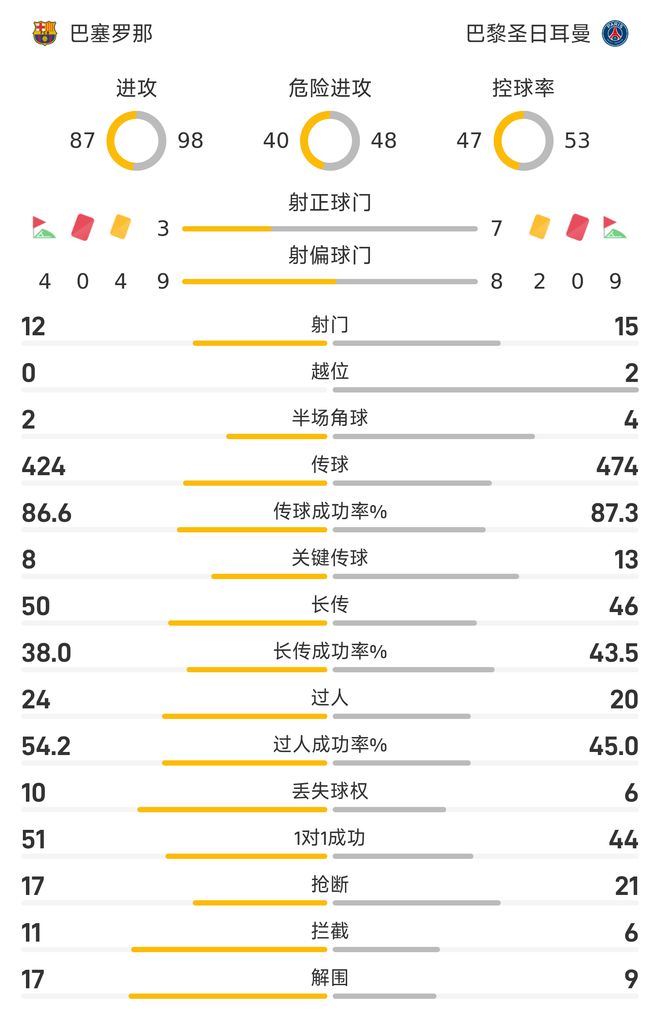 射正73遥遥领先!大巴黎创造机会、控球率等皆优于巴萨