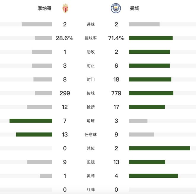 北京时间10月2日,2025-26赛季欧冠联赛阶段第2轮,曼城客场2-2战平摩纳哥,无缘两连胜。哈兰德梅开二度,特泽扳回一球,尼科-冈萨雷斯送点,戴尔点射绝平。 比赛看点 1.哈兰德在欧冠前50场比赛打入52球,比萨格勒布迪纳摩、安德莱赫特、里尔、布鲁日、贝西克塔斯、凯尔特人、加拉塔萨雷、莫斯科中央陆军、帕纳辛奈科斯等9支球队在各自前50场欧冠取得的进球还多。 第11分钟,赖因德斯禁区外右脚远射打上看台。 第15分钟,格瓦迪奥尔挑传,哈兰德禁区内左脚挑射入网,1-0!曼城取得领先。 第18分钟,迪亚塔左路传球,特泽弧顶右脚远射轰入世界波,1-1!摩纳哥扳平。 第25分钟,B席禁区前左脚搓射打得太正。 第34分钟,福登突入禁区右脚爆射击中横梁。 第43分钟,赖因德斯禁区内射门被扑出,哈兰德补射击中边网。 第44分钟,奥莱利左路传中,哈兰德禁区中路高高跃起,头球梅开二度,2-1! 第58分钟,罗德利放倒库里巴利,吃到黄牌。 第73分钟,赖因德斯禁区内扣球过人,左脚抽射击中横梁。 第90分钟,尼科-冈萨雷斯禁区内踢倒戴尔的头部,点球!戴尔主罚点球破门,2-2!