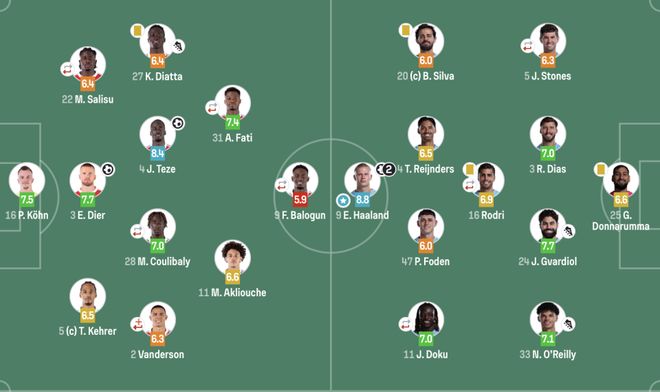 数据统计 出场阵容 曼城(4141):25-多纳鲁马;5-斯通斯(73’27-努内斯),3-迪亚斯,24-格瓦迪奥尔,33-奥莱利;16-罗德里(61’14-尼科);20-B席,4-赖因德斯,47-福登,11-多库(61’26-萨维尼奥);9-哈兰德 摩纳哥(3421):16-科恩;5-科雷尔,3-戴尔,3-萨利苏;2-万德森,4-特泽,28-库里巴利,27-迪亚塔;11-阿克利乌舍,31-法蒂;9-巴拉贡 |