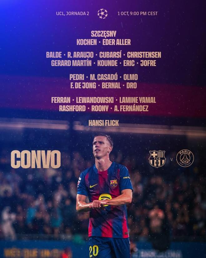 雷速体育10月1日讯 欧冠第二轮,巴萨vs巴黎。赛前,巴萨公布本场比赛大名单。 名单如下 门将:什琴斯尼、科亨、埃德尔·阿勒 后卫:巴尔德、阿劳霍、库巴西、克里斯滕森、杰拉德·马丁、孔德、埃里克·加西亚、霍夫雷-托伦茨 中场:佩德里、卡萨多、奥尔莫、德容、伯纳尔、德罗 前锋:费兰·托雷斯、莱万、亚马尔、拉什福德、巴德吉、托尼·费尔南德斯 |
