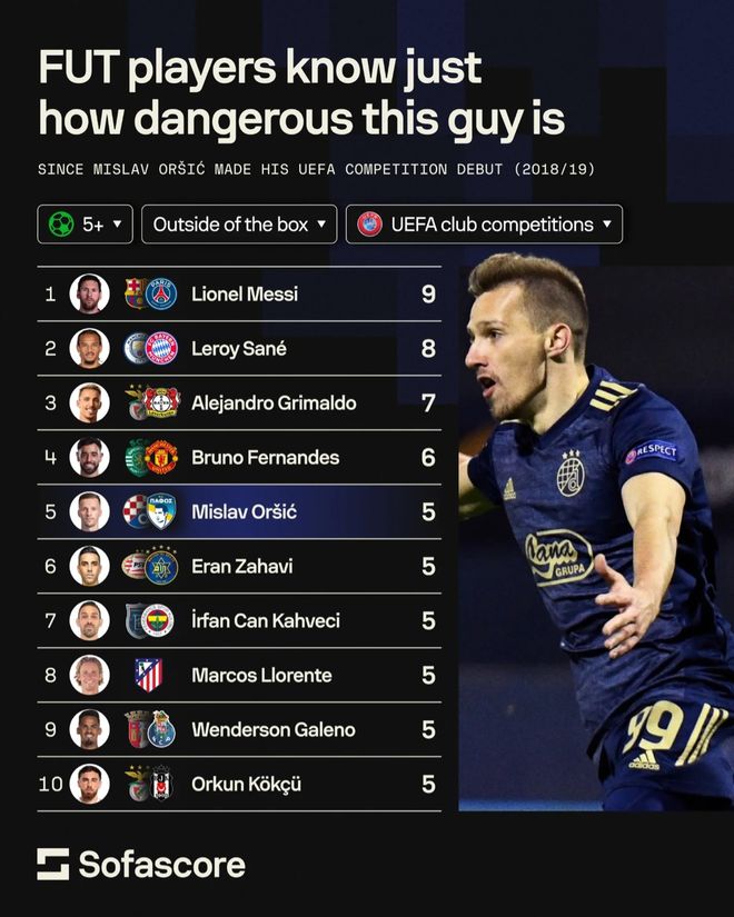 10月2日。欧冠继续进行,有不同媒体也统计并公布了一些跟欧冠有关的数据,其中梅西都是第一!不愧是欧冠之王、足球之神。 比如Sofascore,他们就给出一个过去8个赛季欧冠禁区外远射进球榜。为什么是过去八年呢?因为这是给刚激活个人里程碑的米斯拉夫·奥尔西奇定制的数据。这也很好说明了梅西的实力,无论给谁定制数据,他都可以是第一、第一档或者独一档。 米斯拉夫·奥尔西奇就是从八年前的2019赛季开始踢欧冠的,他刚激活一个里程碑,就是欧冠禁区外远射进球,5个,这追平了前十的门槛。历史上刚好只有10个球员在欧冠有过至少5个禁区外远射进球。米斯拉夫·奥尔西奇是最近的一个,跟他一样有5个的是扎哈维、卡赫韦奇、略伦特、加来诺、柯克曲。B费排名第4,有6个。亚历杭德罗·格里马尔多第三,7个。萨内第二,8个。梅西是金靴,9个。前十没有C罗,C罗连5个都达不到。 在曼城2比2摩纳哥的比赛中,哈兰德上半场就梅开二度,曼城2比0领先,但后来还是被法甲球队给扳平了。哈兰德在欧冠有一个里程碑,而且是仅次于梅西那种。根据媒体StatMuse FC的统计,哈兰德26岁前、50场欧冠就进52个球,仅次于梅西,梅西26岁前有59个欧冠进球。姆巴佩在26岁前有50个球,历史第三。 姆巴佩在这个榜单是第三,但他近期也有自己的里程碑。在皇马5比0虐菜阿拉木图凯拉特的欧冠比赛中,姆巴佩帽子戏法,他用89场达成欧冠60球。莱万第二,85场60球。C罗第四,98场60球。本泽马111场60球,以前的欧冠历史第一射手劳尔,115场60球。历史第一自然还是梅西,80场就60球。 |