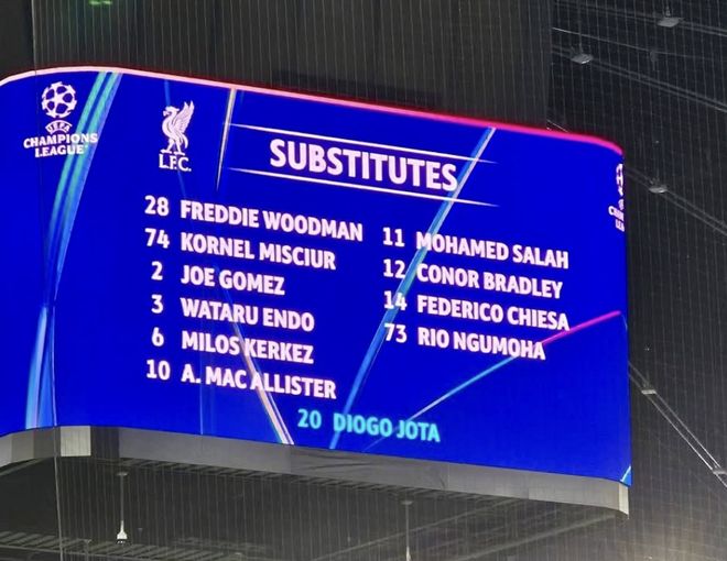 雷速体育10月23日讯 欧冠联赛阶段第三轮,利物浦客场挑战法兰克福。半场结束利物浦3-1领先法兰克福。比赛中出现暖心一幕,法兰克福主场的大屏幕显示利物浦替补球员时,加入了今夏不幸离世的若塔的名字。 |