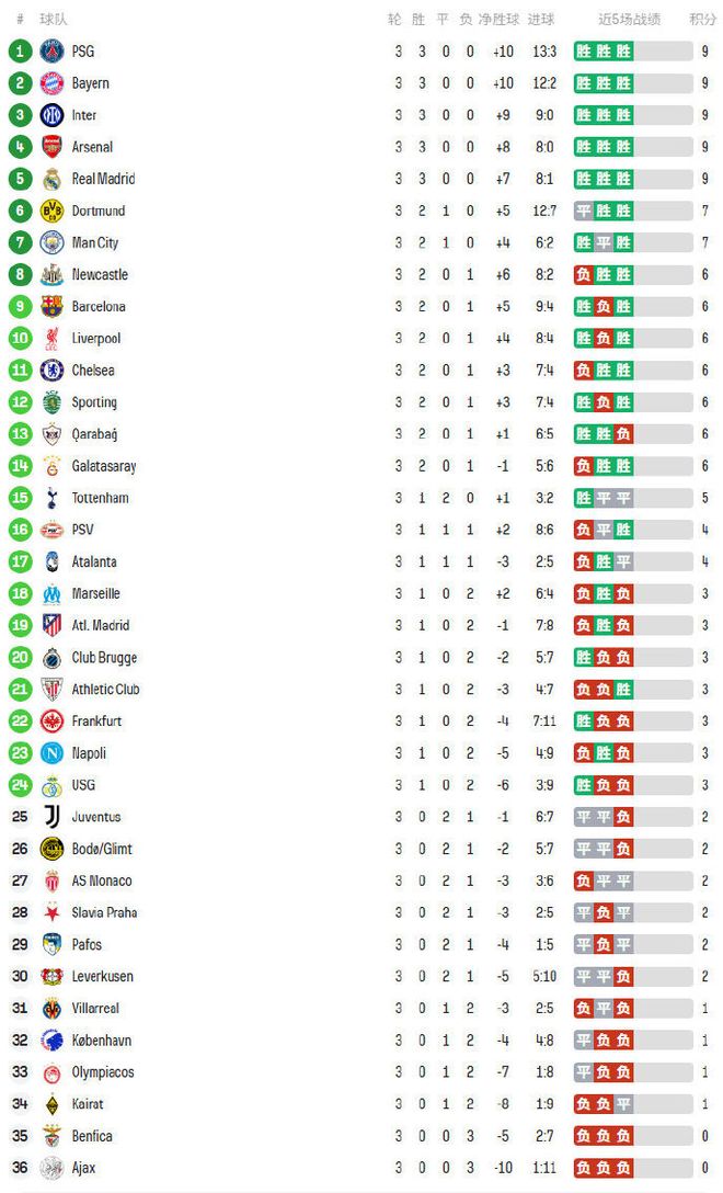 北京时间10月23日,2025-26赛季欧冠联赛阶段第3轮全部结束。本轮过后积分榜也发生了巨大变化。共有5支球队依然保持全胜,而也有2支昔日豪门表现糟糕3战全败。 保持全胜的球队分别是卫冕冠军巴黎圣日耳曼,还有拜仁、国米、阿森纳和皇马。其中,巴黎凭借净胜球优势暂时领跑欧冠积分榜。大黑马卡拉巴赫本轮客场被毕巴逆转后。2连胜终结遭遇首败。 此外,多特蒙德和曼城也都保持不败,战绩为2胜1平。而2胜1负的豪门则有巴萨、利物浦、切尔西、纽卡斯尔等队。而同为豪门的尤文和勒沃库森都是2平1负,3轮过后1胜难求。 目前,仍有2支球队开局3连败。他们分别是穆帅执教的本菲卡和荷甲昔日霸主阿贾克斯。两队都曾问鼎欧冠冠军,但如今在欧冠却开局艰难,排名积分榜最后2位,晋级形势堪忧。 下轮比赛,将有多场“世纪大战”引人关注。利物浦在主场迎战皇马;大巴黎则在主场对阵拜仁,曼城则在主场过招多特蒙德。三场比赛都堪称话题性十足。其中拜仁和大巴黎注定至少要有一支球队全胜的表现被终结。 |