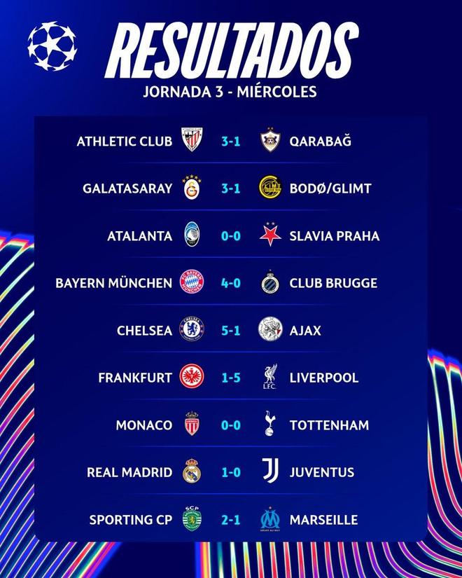 其中巴黎和拜仁将在下一轮比赛迎来正面对决,另一支全胜球队皇家马德里将客场挑战利物浦。