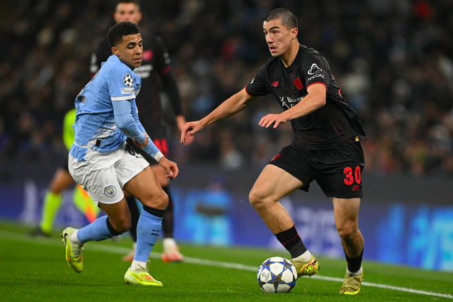 即便如此,曼城还是明显占据了场面上的主动权,但率先进球的却是勒沃库森,第20分钟,阿莱克斯·加西亚传中,科法内标志性地回做停球,边后卫格里马尔多一脚怒射,打破僵局。