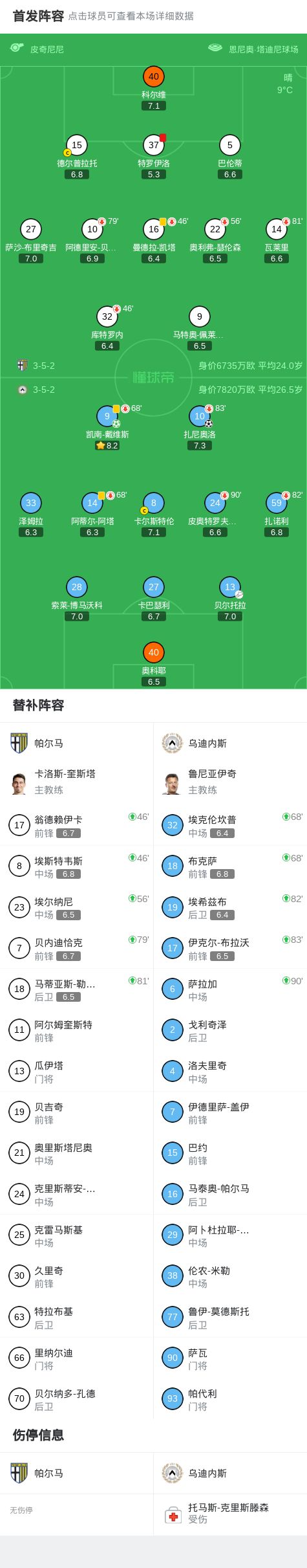 第11分钟,乌迪内斯球员贝尔托拉助攻扎尼奥洛打入一球。 第64分钟,帕尔马球队特罗伊洛吃到红牌。 第65分钟,乌迪内斯球员凯南-戴维斯罚入点球。 下半场补时第3分钟,乌迪内斯球队Kosta Runjaić吃到红牌。 球队阵容